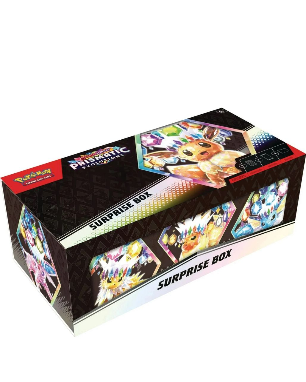 This prismatic evolutions Surprise Box is a themed bundle from the Prismatic Evolutions expansion of the Pokémon Trading Card Game.